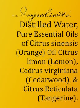 - Ingredients: Purified water and pure essential oils from Citrus sinensis (orange), Citrus reticulata (tangerine), Citrus limon (lemon), and Cedrus atlantica (cedarwood).
